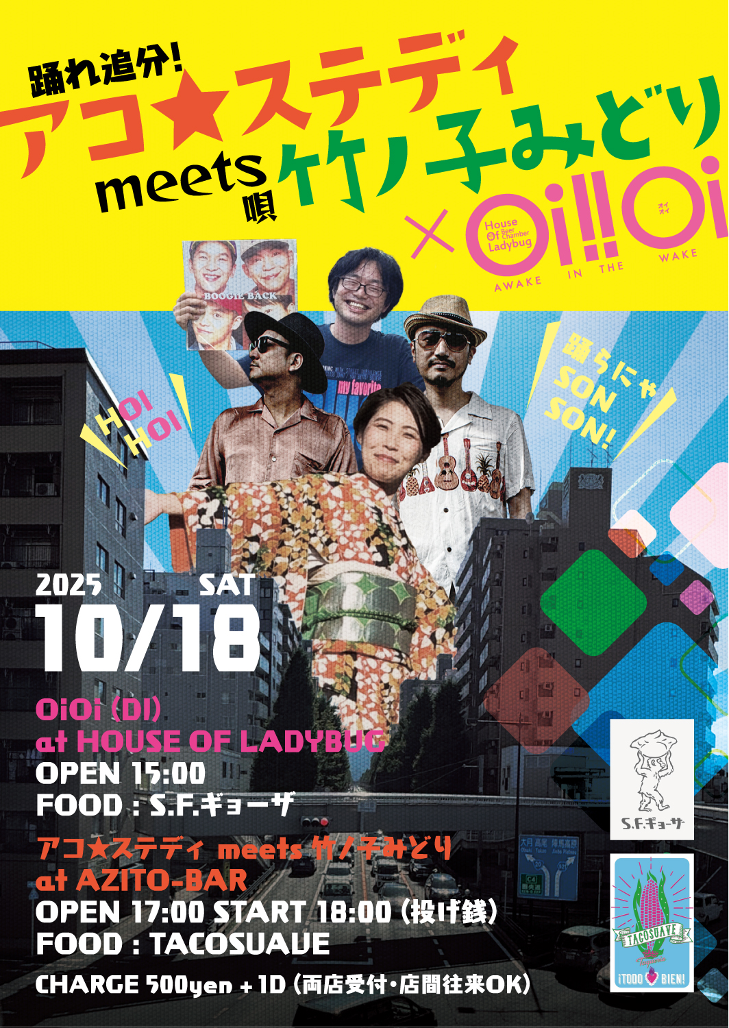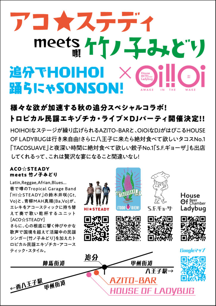 2025.10.18 ACO☆STEADY meets 竹ノ子みどり at 八王子AZITO-BAR 未分類 2025.09.17 OIOI(DJ) at HOUSE OF LADYBUG OPEN 15:00 FOOD: S.F.ギョーザ ACO☆STEADY meets 竹ノ子みどり at AZITO-BAR OPEN 17:00 START 18:00 (投げ銭) FOOD: TACOSUAVE CHARGE 500yen+1D(両店受付・店間往来OK)